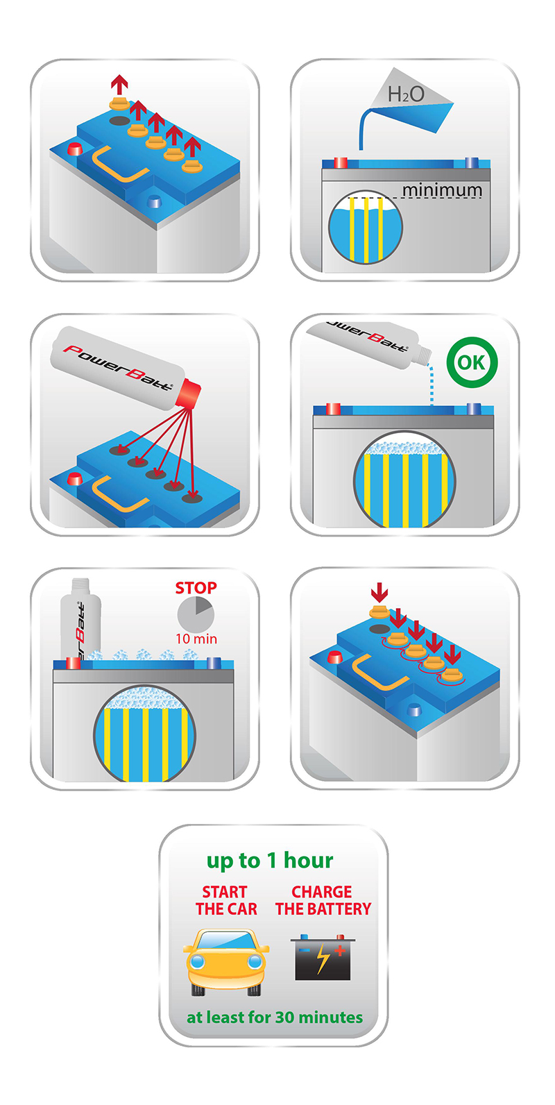 3. Make sure the volume of electrolyte (in all battery´s cells) covers at least the electrode plates; if necessary, add distilled water while leaving sufficient space for PowerBatt to be applied.